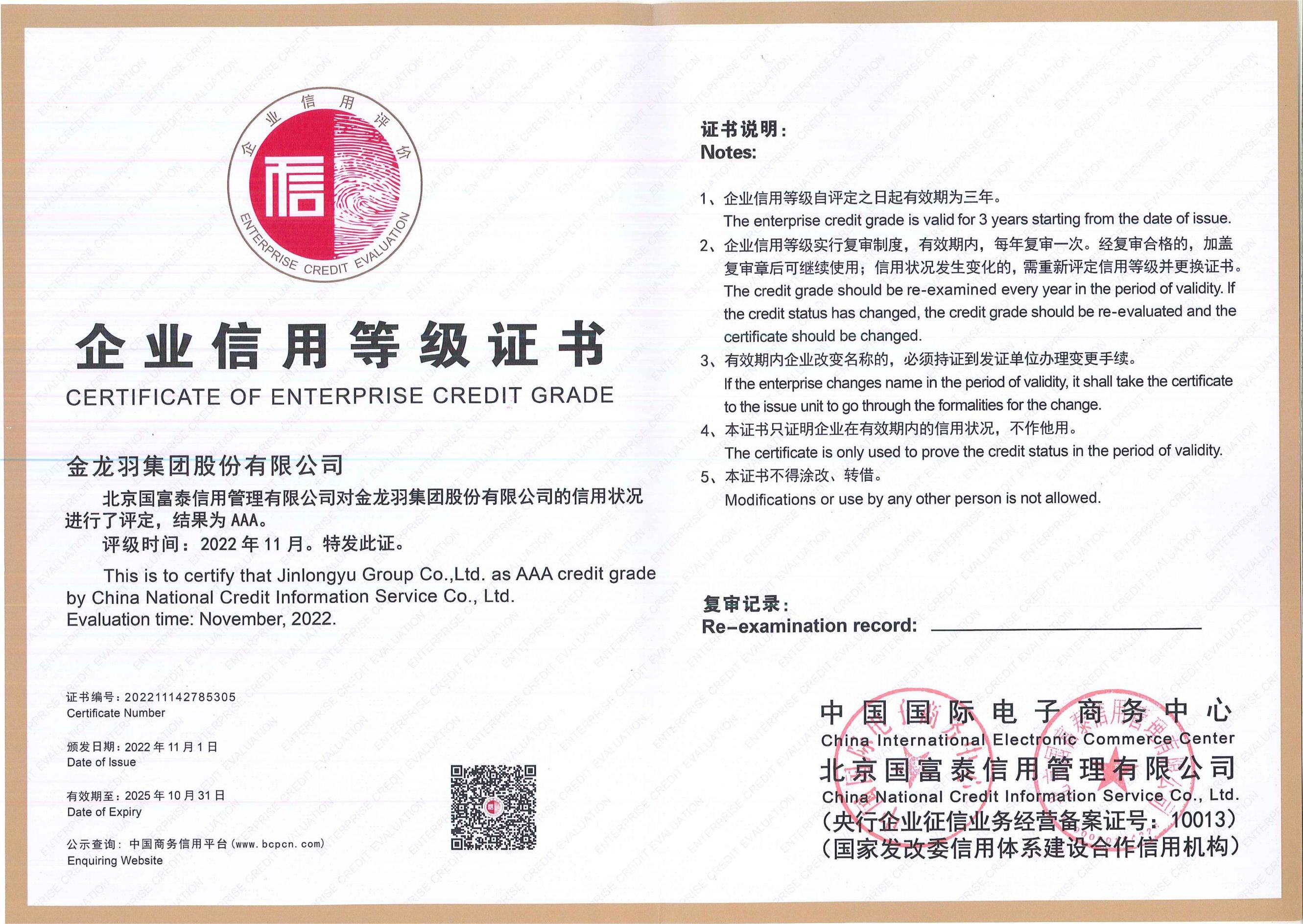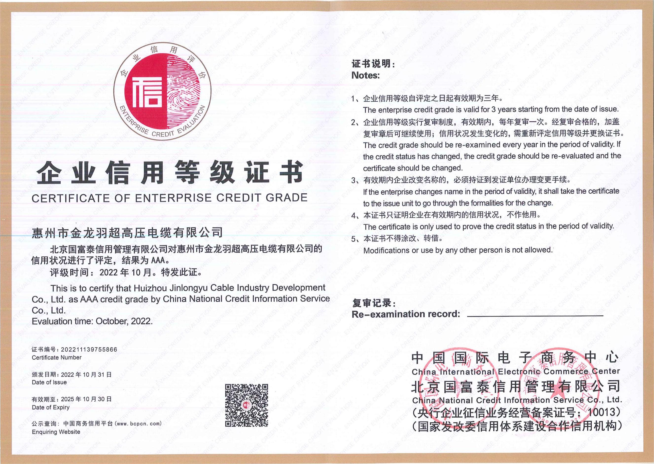 惠州市金龍羽超高壓電纜有限公司企業信用等級證書